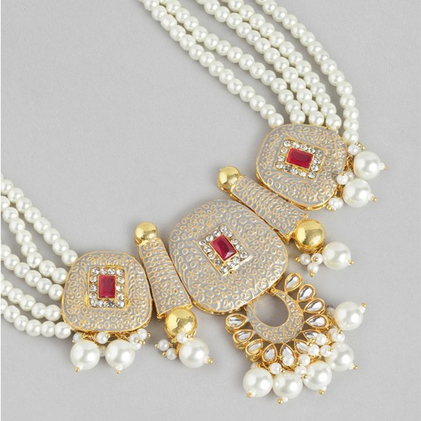 Grey and white gold-plated necklace has beads & stone-studded details, secured with a drawstring closure